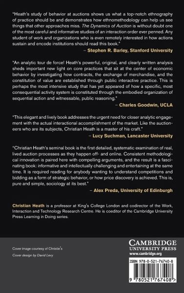 Each year art and antiques worth many billions of pounds are sold at auction. These auctions consist of numerous, intense episodes of social interaction through which the price of goods rapidly escalates until sold on the strike of a hammer. In this book, Christian Heath examines the fine details of interaction that arises at auctions, the talk and visible conduct of the participants and their use of various tools and technologies. He explores how auctioneers, buyers and their representatives are able to transact the sale of diversely priced goods in just seconds. Heath addresses how order, trust and competition are established at auctions and demonstrates how an economic institution of some global importance is founded upon embodied action and interaction. The analysis is based on video recordings of sales of art and antiques gathered within a range of national and international auction houses in Europe and the United States.