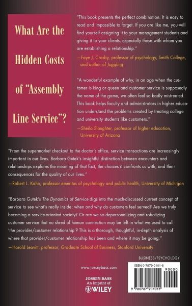 "Barbara Gutek's The Dynamics of Service digs into themuch-discussed current concept of service to see what's reallyinside: when and why do customers feel served? Are we trulybecoming a service-oriented society? Or are we so deperonalizingand robotizing customer service that no shred of human connectionmay be left in what we used to call 'the provider/customerrelationship'? This is a thorough, thoughtful, in-depth analysis ofwhere that provider/customer relationship has been and where it maybe going." --Harold Leavitt, professor, Graduate School ofBusiness, Stanford University