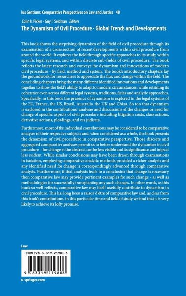 Furthermore, most of the individual contributions may be considered to be comparative analyses of their respective subjects and, when considered as a whole, the book presents the dynamism of civil procedure in comparative perspective. Those discrete and aggregated comparative analyses permit us to better understand the dynamism in civil procedure - for change in the abstract can be less visible and its significance and impact less evident. While similar conclusions may have been drawn through examinations in isolation, employing comparative analytic methods provided a richer analysis and any identified need for change is correspondingly advanced through comparative analysis. Furthermore, if that analysis leads to aconclusion that change is necessary then comparative law may provide pertinent examples for such change - as well as methodologies for successfully transplanting any such changes. In other words, as this book so well reflects, comparative law may itself usefully contribute to dynamism in civil procedure. This has long been a raison d'être of comparative law and, as clear from this book's contributions, in this particular time and field of study we find that it is very likely to achieve its lofty promise.