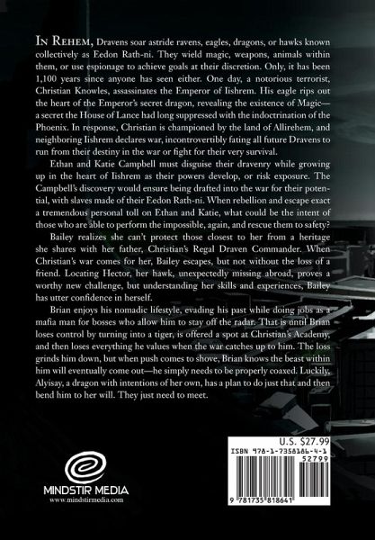 In Rehem, Dravens soar astride ravens, eagles, dragons, or hawks known collectively as Eedon Rath-ni. They wield magic, weapons, animals within them, or use espionage to achieve goals at their discretion. Only, it has been 1,100 years since anyone has seen either. One day, a notorious terrorist, Christian Knowles, assassinates the Emperor of Iishrem. His eagle rips out the heart of the Emperor's secret dragon, revealing the existence of Magic-a secret the House of Lance had long suppressed with the indoctrination of the Phoenix. In response, Christian is championed by the land of Allirehem, and neighboring Iishrem declares war, incontrovertibly fating all future Dravens to run from their destiny in the war or fight for their very survival. Ethan and Katie Campbell must disguise their dravenry while growing up in the heart of Iishrem as their powers develop, or risk exposure. The Campbell's discovery would ensure being drafted into the war for their potential, with slaves made of their Eedon Rath-ni. When rebellion and escape exact a tremendous personal toll on Ethan and Katie, what could be the intent of those who are able to perform the impossible, again, and rescue them to safety? Bailey realizes she can't protect those closest to her from a heritage she shares with her father, Christian's Regal Draven Commander. When Christian's war comes for her, Bailey escapes, but not without the loss of a friend. Locating Hector, her hawk, unexpectedly missing abroad, proves a worthy new challenge, but understanding her skills and experiences, Bailey has utter confidence in herself. Brian enjoys his nomadic lifestyle, evading his past while doing jobs as a mafia man for bosses who allow him to stay off the radar. That is until Brian loses control by turning into a tiger, is offered a spot at Christian's Academy, and then loses everything he values when the war catches up to him. The loss grinds him down, but when push comes to shove, Brian knows the beast within him will eventually come out-he simply needs to be properly coaxed. Luckily, Alyisay, a dragon with intentions of her own, has a plan to do just that and then bend him to her will. They just need to meet.