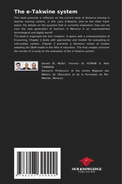This book presents a reflection on the current state of distance training in teacher training centers, in this case e-Takwine, and on the other hand opens the debate on the question that is currently imperative: how can we train the next generation of teachers in Morocco in an unprecedented technological and digital world?The book is organized into four chapters. It opens with a contextualization of E-Learning. Chapter 2 deals with approaches and models for evaluating an information system. Chapter 3 presents a literature review of studies adopting the D&M model in the field of education. The final chapter presents the results of a study on the evaluation of the e-Takwine system.