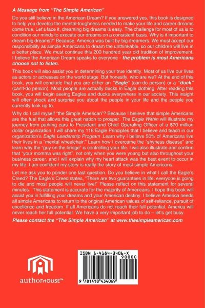 Do you still believe in the American Dream? If you answered yes, this book is designed to help you develop the mental-toughness needed to make your life and career dreams come true. Let's face it, dreaming big dreams is easy. The challenge for most of us is to condition our minds to execute our dreams on a consistent basis. Why is it important to dream big dreams?" Because, America was built by big dreamers. We must accept our responsibility as simple Americans to dream the unthinkable, so our children will live in a better place. We must continue this 200 hundred year old tradition of improvement. I believe the American Dream speaks to everyone - the problem is most Americans choose not to listen. This book will also assist you in determining your true identity. Most of us live our lives as actors or actresses on the world stage. But honestly, who are we? At the end of this book, you will conclude that you are either an "Eagle" (can-do person) or a "duck" (can't-do person). Most people are actually ducks in Eagle clothing. After reading this book, you will begin seeing Eagles and ducks everywhere in our society. This insight will often shock and surprise you about the people in your life and the people you currently look up to. Why do I call myself "the Simple American"? Because I believe that simple Americans are the fuel that allows this great nation to prosper. The Eagle Within will illustrate my journey from parking cars to President and Chief Operating Officer of a $70 million dollar organization. I will share my 118 Eagle Principles that I believe and teach in our organization's Eagle Leadership Program .Learn why I believe 50% of Americans live their lives in a "mental wheelchair." Learn how I overcame the "shyness disease" and learn why the "guy on the bridge" is controlling your life. I will also illustrate and confirm that "your momma was right", not only when you were young but also throughout your business career, and I will explain why my heart attack was the best event to occur in my life. I am confident my story is really the story of most simple Americans. Let me ask you to ponder one last question. Do you believe in what I call the Eagle's Creed? The Eagle's Creed states, "There are two guarantees in life: everyone is going to die and most people will never live!" Please reflect on this statement for several minutes. This statement is accurate for the majority of Americans. I hope this book will assist you in fulfilling your dreams and your American destiny. I believe America needs all simple Americans to return to the original American values of self-reliance, pursuit of excellence and freedom. If all Americans do not reach their full potential, America will never reach her full potential. We have a very important job to do - let's get busy. Please contact the "The Simple American" at www.thesimpleamerican.com