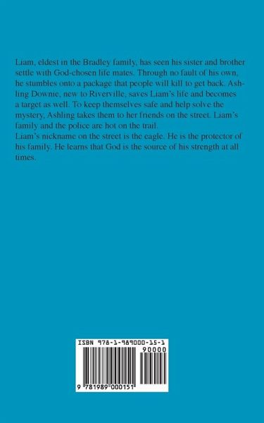 The Eagle - the story of Liam Bradley and Ashling Downie Liam, eldest in the Bradley family, has seen his sister and brother settle with God-chosen life mates. Through no fault of his own, he stumbles onto a package that people will kill to get back. Ashling Downie, new to Riverville, saves Liam's life and becomes a target as well. To keep themselves safe and help solve the mystery, Ashling takes them to her friends on the street. Liam's family and the police are hot on the trail. Liam's nickname on the street is the eagle. He is the protector of his family. He learns that God is the source of his strength at all times.