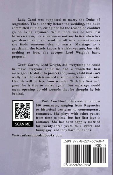 Lady Carol was supposed to marry the Duke of Augustine. Then, shortly before the wedding, the duke committed suicide, citing her for the reason he couldn't go on living anymore. While there was no love lost between them, her situation is not any better when her guardian threatens to send her off to a convent unless she finds someone else to marry. Marriage to a gentleman she barely knows is a risky venture, but with nothing to lose, she accepts Lord Wright's hasty proposal. Grant Carnel, Lord Wright, did everything he could to make everyone think he had a wonderful first marriage. He did it to protect the young child that isn't really his. He is determined that no one learn the truth. Her life will be free from scandal. With his first wife gone, he is free to marry again. But marriage would mean opening up old wounds that he thought he left behind.