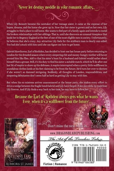 Never let destiny meddle in your romantic affairs... When Lily Bennett became the caretaker of her teenage sister, it came at the expense of her hopes, dreams, and the home she grew up in. Now that her sister is grown and on her own, Lily struggles to find a place to call home. She wants to feel part of a family again and intends to mend the broken relationships with her siblings. That is, until she discovers an unusual timepiece that lands her in Regency England at the feet of one of the most eligible men in society. Unfortunately, he believes that she's crazy. Any attraction Lily feels for the stubborn man is clearly one-sided. Too bad she's stuck with him until she can figure out how to get home. Gabriel Hawthorne, Earl of Rothden, has decided to host one last house party before returning to London for the dreaded season where every simpering chit and money-hungry mother will hover around him like flies. Add to that his sister's hunt for a husband and Gabriel would rather shoot himself than a grouse. Still, it's his duty to find his sister a suitable match, which he'll do after one last bit of respite to shore up his defenses. A respite interrupted when a pretty little wallflower in scandalous clothes lands at his feet claiming to be from the future. He'd turn her over to doctors if she weren't so damned intriguing. Suddenly, all thoughts of London, responsibilities, and simpering debutantes don't seem half as hard as getting Lily to stay with him. But when his ex-mistress arrives unannounced at the house party, she makes every effort to drive a wedge between the fragile bond Gabriel and Lily have forged. If she succeeds, he could lose Lily forever. And if Lily finds a way back to her time, he may have to follow her. Because the Earl of Rothden always gets what he wants. Even when it's a wallflower from the future. Taken by Destiny The Earl's Timely Wallflower Tempting the Reclusive Earl Touching the Hero's Heart