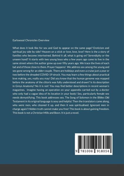 Earlswood Chronicles Description What does it look like for sex and God to appear on the same page? Eroticism and spiritual joy side by side? Heaven on a stick or love, love, love? Here is the a story of families who become intertwined. Behind it all, what is going on? Serendipity or the unseen hand? It starts with two young boys who a few years ago came to live in the same street where the author grew up over fifty years ago. We trace the lives of each lad and of those close to them. Prayer happens! We address sex among the young and sex gone wrong for an older couple. There are holidays and even a cruise just a year or two before the dreaded COVID-19 struck. You may learn a few things about practical love making, yes, really you may! Did you know that the human genome was mapped before the anatomy of the clitoris was fully understood and drawn. Is its description in Greys Anatomy? - No it is not! You may find better descriptions in recent woman's magazines. Imagine having an operation on your appendix carried out by a doctor who only had a vague idea of its location in your body! Sex, particularly female sex needs demystifying. This book addresses sex. The Song of Solomon in the Bibles Old Testament in its original language is sexy and helpful. Then the translators came along, who were men, who cleaned it up, and then it was spiritualised. Ignorant men in charge again? Hidden truth cannot make you free! This book is about gaining freedom. This book is not a Christian Mills and Boon. It is just a novel.