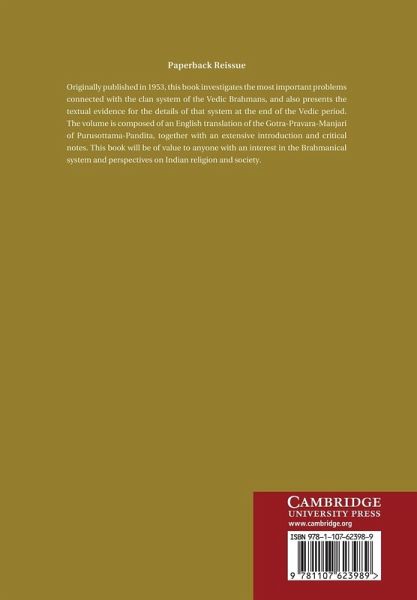 Originally published in 1953, this book investigates the most important problems connected with the clan system of the Vedic Brahmans, and also presents the textual evidence for the details of that system at the end of the Vedic period. The volume is composed of an English translation of the Gotra-Pravara-Manjari of Purusottama-Pandita, together with an extensive introduction and critical notes. This book will be of value to anyone with an interest in the Brahmanical system and perspectives on Indian religion and society.