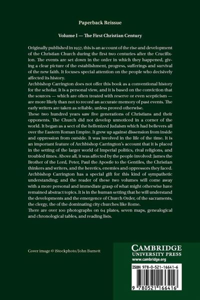 This is a 1957 account of the rise and development of the Christian Church during the first two centuries after the Crucifixion. The events are set down in the order in which they happened, giving a clear picture of the establishment, progress, sufferings and survival of the new faith. It focuses special attention on the men who decisively affected its history. Christianity began as a sect of the Hellenized Judaism which had believers all over the Eastern Roman Empire. It grew up against dissension from inside and oppression from outside. Archbishop Carrington's account of Christianity is placed in the setting of the larger world of Imperial politics, rival religions and troubled times. The author does not offer this book as a conventional history for the scholar, yet it can be read for pleasure as well as for information. There are over 100 photographs and chronological tables, and reading lists.