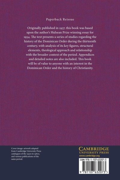 Originally published in 1937, this book was based upon the author's Hulsean Prize winning essay for 1934. The text presents a series of studies regarding the history of the Dominican Order during the thirteenth century, with analysis of its key figures, structural elements, theological approach and relationship with the broader context of the period. Appendices and detailed notes are also included. This book will be of value to anyone with an interest in the Dominican Order and the history of Christianity.