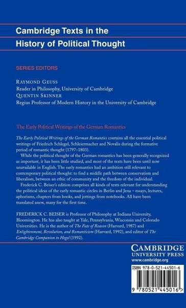 The Early Political Writings of the German Romantics contains all the essential political writings of Friedrich Schlegel, Schleiermacher and Novalis during the formative period of romantic thought (1797 to 1803). While the political thought of the German romantics has been generally recognised as important, it has been little studied, and most of the texts have been until now unavailable in English. The early romantics had an ambition still relevant to contemporary political thought: how to find a middle path between conservatism and liberalism, between an ethic of community and the freedom of the individual. Frederick C. Beiser's edition comprises all kinds of texts relevant for understanding the political ideas of the early romantic circles in Berlin and Jena - essays, lectures, aphorisms, chapters from books, and jottings from notebooks. All have been translated anew, many for the first time.