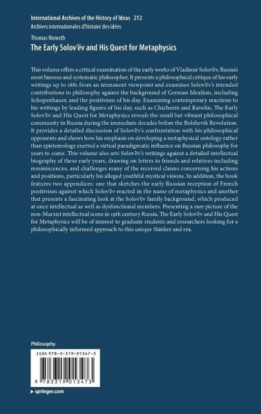 "Solov'ëv's metaphysics is extremely rich in ideas, and, perhaps most importantly, inescapable to anyone seeking to understand the history of Russian metaphysics. For, as the first systematic Russian philosopher, Solov'ëv had a great influence on the posterity of Russian philosophy and, to some extent, framed the way philosophy would be exercised by his successors. ... This book is thus a must-read to anyone interested in the history of Russian metaphysics." (Frederic Tremblay, Quaestio, Yearbook of the History of Metaphysics, Vol. 13, 2013)