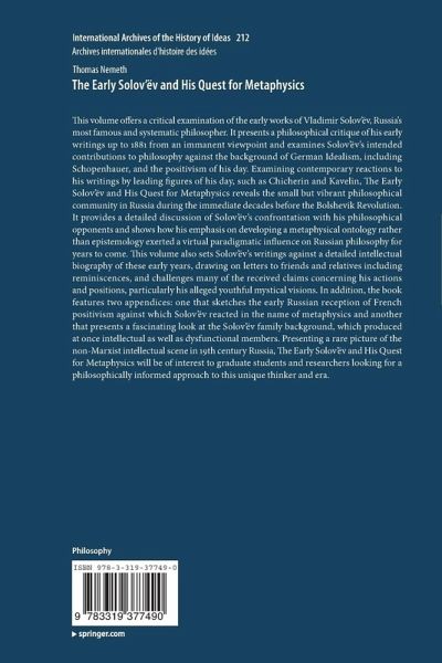 "Solov'ëv's metaphysics is extremely rich in ideas, and, perhaps most importantly, inescapable to anyone seeking to understand the history of Russian metaphysics. For, as the first systematic Russian philosopher, Solov'ëv had a great influence on the posterity of Russian philosophy and, to some extent, framed the way philosophy would be exercised by his successors. ... This book is thus a must-read to anyone interested in the history of Russian metaphysics." (Frederic Tremblay, Quaestio, Yearbook of the History of Metaphysics, Vol. 13, 2013)