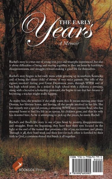 Rachel's story is a true one of young love, joys and triumphs experienced, but also is about difficulties of being and staying together, as they are beset by hardships, disappointments, and struggles toward making a good life for themselves. Rachel's story begins in her early teens while growing up in southern Kentucky, and of being the oldest child of eleven of very strict parents. She tells of the rigours involved during post-Great Depression years, through WWII and of her high school years. As a senior in high school with a diploma a certainty, along with a lucrative scholarship promised, she begins to see that her dreams of becoming a teacher might really happen. As reality hits, she wonders if she really wants this. It means moving away from Denton, her lifetime home, and leaving all the people involved in her life. She has recently met a special person, a returning WWII navy veteran Brad, who has returned home to find his life in an uproar, his children gone, and that his wife has deserted him. As he is attempting to pick up the pieces, he meets Rachel. Rachel's and Brad's life story is one of joys beset by poverty, disappointments, and struggles. From the beginning, they have kept their eyes focused on the light at the end of the tunnel that promises a life of joy, excitement, and plenty. Through it all, their hard work and their love for each other is fortified by their faith in God, a common thread that binds it all together.