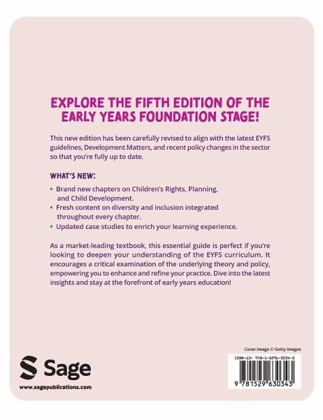 The revised fifth edition of The Early Years Foundation Stage has been fully updated to cover revised EYFS, revised Development Matters and policy shifts in the sector. New to the book: · Brand new chapters on the Rights of the Child, Children’s Development & Learning Theories and Planning. · New content on diversity and inclusion throughout all chapters. · New and updated case studies throughout the book, including international cases. · Additions to chapters on children’s mental health, climate crisis and working with children post-pandemic. This market-leading textbook is an essential guide for students, helping them to develop an understanding of the EYFS curriculum, and encouraging a critical view of the theory and policy behind it to strengthen their practice.