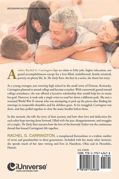 Author Rachel G. Carrington lays no claim to lofty jobs, higher education, nor grand accomplishments except for a love-filled, multifaceted, family-oriented, poverty-to-plenty life. In The Early Years, the first in a series, she shares her story. As a young teenager, just entering high school in the small town of Denton, Kentucky, Carrington planned to attend college and become a teacher. With coursework geared toward college attendance, she was offered a lucrative scholarship that would help her to attain her goal. However, it took only a single event to send her down a different path. She met a returned World War II veteran who was attempting to pick up the pieces after finding his marriage in irreparable shambles and his children gone. As he struggled, Carrington was there, and they pulled together to clear the many hurdles before them. In this memoir, she tells the story of their journey and how their love and dedication for each other kept moving them forward. Filled with the joys, disappointments, and struggles of a couple, The Early Years narrates how the love of the heavenly Father was the continuous thread that bound Carrington's life together.