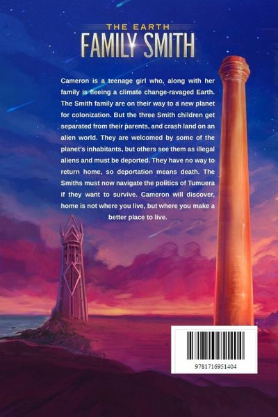 Cameron is a teenage girl who, along with her family is fleeing a climate change-ravaged Earth. The Smith family are on their way to a new planet for colonization. But the three Smith children get separated from their parents, and crash land on an alien world. They are welcomed by some of the planet's inhabitants, but others see them as illegal aliens and must be deported. They have no way to return home, so deportation means death. The Smiths must now navigate the politics of Tumuera if they want to survive. Cameron will discover, home is not where you live, but where you make a better place to live.