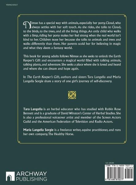 Nimue has a special way with animals, especially her pony, Cloud, who always settles with her soft touch. As she rides, she talks to Cloud, to the birds, to the trees, and all the living things. An only child who walks with a limp, riding her pony makes her feel strong when the real world isn't kind to her. Children tease her because she talks to animals and trees and walks differently than them. Her parents scold her for believing in magic and what they deem a fantasy world. This book for young adults follows Nimue as she seeks to unlock the Earth Keeper's Gift and encounters a magical world filled with talking animals, talking plants, and adventure. She seeks a place where she is loved and heard and where she can dream and hope again. In The Earth Keeper's Gift, authors and sisters Tara Langella and Maria Langella Sorgie share a story of one girl's journey of self-discovery.