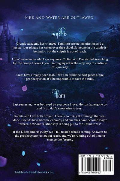 Fire and Water are outlawed.SophiaOrenda Academy has changed. Familiars are going missing, and a mysterious plague has taken over the school. Someone in the castle is behind it, but the culprit is out of reach.I don't even know who I am anymore. To find out, I've started searching for the family I never knew. Finding myself is the only way to continue this journey.Lives have already been lost. If we don't find the next piece of the prophecy soon, it'll be impossible to save the tribe.LiamLast semester, I was betrayed by everyone I love. Months have gone by, and I still don't know who to trust.Sophia and I are both broken. There's no fixing the damage that was done. Friends have become enemies, and enemies have become major threats. Now our relationship is being put to the ultimate test.If the Elders find us guilty, we'll fail to stop what's coming. Answers to the prophecy are just out of reach, and we're running out of time to change the future...