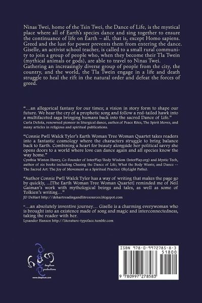 The Earth Woman Tree Woman Quartet is a near future fantasy set in the mystical world of Ninas Twei and the real world country of Uhs. In Ninas Twei all of Earth's species dance and sing together to ensure the continuance of life on Earth -- all, that is, except Homo sapiens. Greed and the lust for power has barred them from the dance. A small gray cat, a red-tailed hawk, and a mysterious homeless woman urge teacher Giselle to "go north" where she finds a new job in a small rural community. There she hears songs from the earth and the trees which lead her to a group of people who, becoming their Tla Twein (mythical animals or gods), travel to Ninas Twei. Gathering an increasingly diverse group of people from the city, the country, and the world, the Tla Twein engage in a life and death struggle to heal the rift in the natural order and defeat the forces of greed. But they know this is just one step in the journey. They must stay vigilant if humans are to stay in the dance. Giselle, now the Earth Woman Tree Woman, joins with the Wolfwind, and together they become all things - earth, air, and water; flora and fauna - a compassionate force for the well-being of the earth. The Earth Woman Tree Woman Quartet contains four illustrations and many songs, some of which have been set to music and can be found at earthwomantreewoman.com.