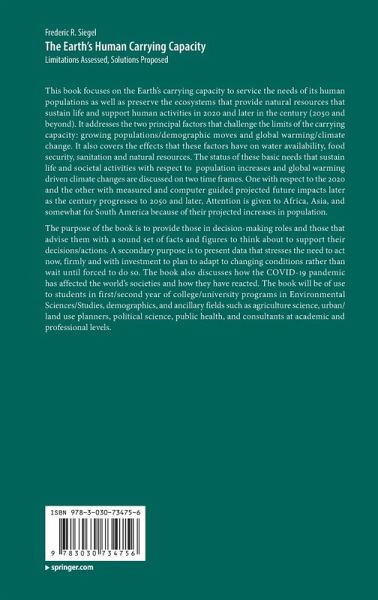Chapter1.- Earth's Human Carrying Capacity: The Basics.- Chapter2.- Water: A Limit On Our Earth's Carrying Capacity.- Chapter3.- Food Security/Insecurity, Food Systems.- Chapter4.- Impact of Global Warming/Climate Change On Food Security 2020.- Chapter 5.- Sanitation: Waste Generation/Capture/Disposal Status 2020.- Chapter6.- Access To Natural Resources Not Water Or Food 2020.- Chapter7.- Global Warming And Water 2050: More People, Yes; Less Ice, Yes; More Water, Yes; More Fresh Water, Probably; More Accessible Fresh Water.- Chapter8.- Food 2050 - More Mouths To Feed: Food Availability and Access.- Chapter9.-Sanitation 2050.- Chapter10.- Natural Resources Beyond Water And Food 2020 To 2050.- Chapter11.- Economic Realities in 2020 Populations: What do they Portend for 2050? 2100?