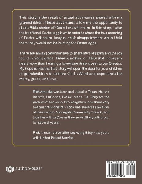 This story is the result of actual adventures shared with my grandchildren. These adventures allow me the opportunity to share Bible stories of God's love with them. In this story, I alter the traditional Easter egg hunt in order to share the true meaning of Easter with them. Imagine their disappointment when I told them they would not be hunting for Easter eggs. There are always opportunities to share life's lessons and the joy found in God's grace. There is nothing on earth that moves my heart more than hearing a loved one draw closer to our Creator. My hope is that this little story will open the door for your children or grandchildren to explore God's Word and experience his mercy, grace, and love.