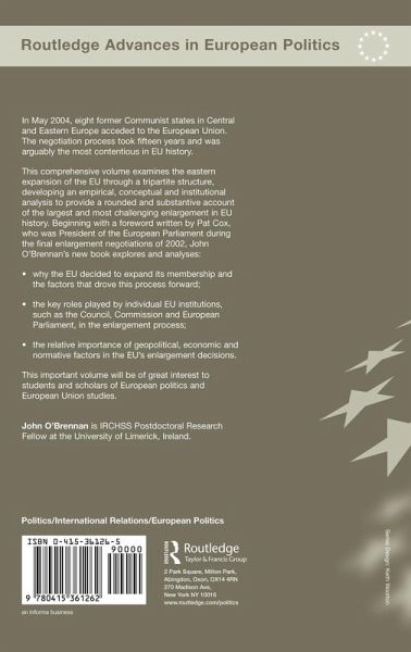 In May 2004, eight former communist states in Central and Eastern Europe acceded to the European Union. This new book examines the Eastern expansion of the EU through a tripartite structure, developing an empirical, conceptual and institutional analysis to provide a rounded and substantive account of EU enlargement, with new theoretical insights. The foreword is by written by Pat Cox, former president of the European Parliament. John O'Brennan also explores: why the EU decided to expand its membership what factors drove this process forward? how did the institutional environment of the EU influence enlargement outcomes? In this context he comprehensively covers the role of the European Council, Commission and Parliament. This important volume will of great interest to students and scholars of European politics and European Union studies.