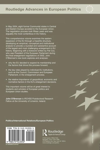 In May 2004, eight former communist states in Central and Eastern Europe acceded to the European Union. This new book examines the Eastern expansion of the EU through a tripartite structure, developing an empirical, conceptual and institutional analysis to provide a rounded and substantive account of EU enlargement, with new theoretical insights. The foreword is by written by Pat Cox, former president of the European Parliament. John O'Brennan also explores: why the EU decided to expand its membership what factors drove this process forward? how did the institutional environment of the EU influence enlargement outcomes? In this context he comprehensively covers the role of the European Council, Commission and Parliament. This important volume will of great interest to students and scholars of European politics and European Union studies.