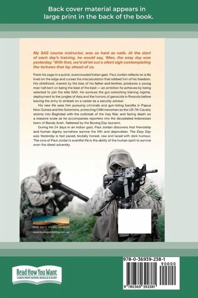 My SAS selection course instructor, was as hard as nails. At the start of each day's training, he would say, 'Men, the easy day was yesterday.' With that, we'd all let out a silent sigh contemplating the tortures that lay ahead of us. From his cage in a putrid, overcrowded Indian gaol, Paul Jordan reflects on a life lived on the edge and curses the miscalculation that robbed him of his freedom. His childhood, marred by the loss of his father and brother, produce a young man hell bent on being the best of the best - an ambition he achieves by being selected to join the elite SAS. He survives the gut-wrenching training regime, deployment to the jungles of Asia and the horrors of genocide in Rwanda before leaving the army to embark on a career as a security adviser. His new life sees him pursuing criminals and gun-toting bandits in Papua New Guinea and the Solomons, protecting CNN newsmen as the US 7th Cavalry storms into Baghdad with the outbreak of the Iraq War, and facing death on a massive scale as he accompanies reporters into the devastated Indonesian town of Banda Aceh, flattened by the Boxing Day tsunami. During his 24 days in an Indian gaol, Paul Jordan discovers that friendship and human dignity somehow survive the filth and deprivation. This is a personal account of a tough, hardened fighter who suddenly finds himself totally dependent on others for his every need. The Easy Day was Yesterday is fast paced, brutally honest and raw, but laced with dark humour. The core of Paul Jordan's eventful life, however, is the strength of his bonds with family and friends and the ability of the human spirit to survive even the direst adversity.