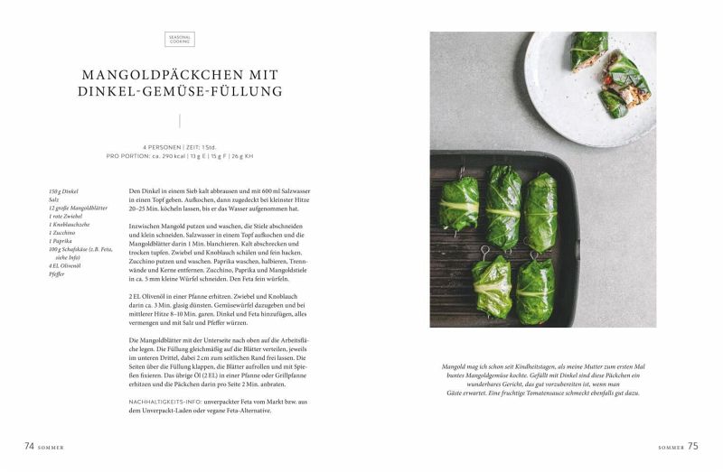 Im wunderschön gestalteten Buch finden sich einfache, köstliche, vegane, vegetarische und saisonale Rezepte mit regionalen Zutaten. Wer mit Obst und Gemüse kocht, das im eigenen Land wächst und auf Flugware verzichtet, tut ebenso viel Gutes wie mit dem Verzicht auf Fleisch.