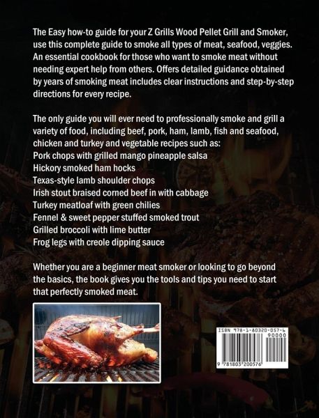 The Easy how-to guide for your Z Grills Wood Pellet Grill and Smoker, use this complete guide to smoke all types of meat, seafood, veggies. An essential cookbook for those who want to smoke meat without needing expert help from others. Offers detailed guidance obtained by years of smoking meat includes clear instructions and step-by-step directions for every recipe. The only guide you will ever need to professionally smoke and grill a variety of food, including beef, pork, ham, lamb, fish and seafood,chicken and turkey and vegetable recipes such as: Pork chops with grilled mango pineapple salsa Hickory smoked ham hocks Texas-style lamb shoulder chops Irish stout braised corned beef in with cabbage Turkey meatloaf with green chilies Fennel & sweet pepper stuffed smoked trout Grilled broccoli with lime butter Frog legs with creole dipping sauce Whether you are a beginner meat smoker or looking to go beyond the basics, the book gives you the tools and tips you need to start that perfectly smoked meat.