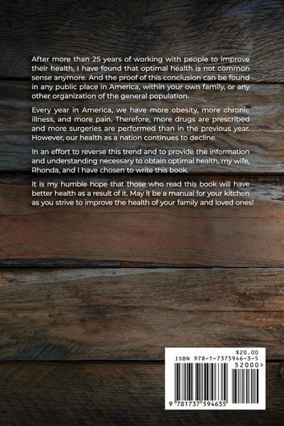 After more than 25 years of working with people to improve their health, I have found that optimal health is not common sense anymore. And the proof of this conclusion can be found in any public place in America, within your own family, or any other organization of the general population. Every year in America, we have more obesity, more chronic illness, and more pain. Therefore, more drugs are prescribed and more surgeries are performed than in the previous year. However, our health as a nation continues to decline. In an effort to reverse this trend and to provide the information and understanding necessary to obtain optimal health, my wife, Rhonda, and I have chosen to write this book. It is my humble hope that those who read this book will have better health as a result of it. May it be a manual for your kitchen as you strive to improve the health of your family and loved ones!