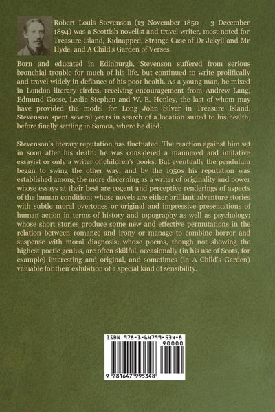 Robert Louis Stevenson (13 November 1850 – 3 December 1894) was a Scottish novelist and travel writer, most noted for Treasure Island, Kidnapped, Strange Case of Dr Jekyll and Mr Hyde, and A Child's Garden of Verses. Born and educated in Edinburgh, Stevenson suffered from serious bronchial trouble for much of his life, but continued to write prolifically and travel widely in defiance of his poor health. As a young man, he mixed in London literary circles, receiving encouragement from Andrew Lang, Edmund Gosse, Leslie Stephen and W. E. Henley, the last of whom may have provided the model for Long John Silver in Treasure Island. Stevenson spent several years in search of a location suited to his health, before finally settling in Samoa, where he died. Stevenson’s literary reputation has fluctuated. The reaction against him set in soon after his death: he was considered a mannered and imitative essayist or only a writer of children’s books. But eventually the pendulum began to swing the other way, and by the 1950s his reputation was established among the more discerning as a writer of originality and power whose essays at their best are cogent and perceptive renderings of aspects of the human condition; whose novels are either brilliant adventure stories with subtle moral overtones or original and impressive presentations of human action in terms of history and topography as well as psychology; whose short stories produce some new and effective permutations in the relation between romance and irony or manage to combine horror and suspense with moral diagnosis; whose poems, though not showing the highest poetic genius, are often skillful, occasionally (in his use of Scots, for example) interesting and original, and sometimes (in A Child’s Garden) valuable for their exhibition of a special kind of sensibility. (wikipedia.org)