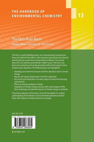 The Ebro is a typical Mediterranean river characterized by seasonal low flows and extreme flush effects, with important agricultural and industrial activity that has caused heavy contamination problems. This volume deals with soil-sediment-groundwater related issues in the Ebro river basin and summarizes the results generated within the European Union-funded project AquaTerra. The following topics are highlighted: Hydrology and sediment transport and their alterations due to climate change, aquatic and riparian biodiversity in the Ebro watershed, occurrence and distribution of a wide range of priority and emerging contaminants, effects of chemical pollution on biota and integration of climate change scenarios with several aspects of the Ebro's hydrology and potential impacts of climate change on pollution.