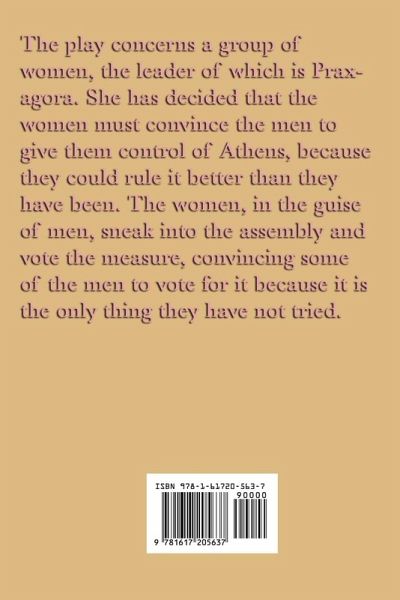 The play concerns a group of women, the leader of which is Praxagora. She has decided that the women must convince the men to give them control of Athens, because they could rule it better than they have been. The women, in the guise of men, sneak into the assembly and vote the measure, convincing some of the men to vote for it because it is the only thing they have not tried.