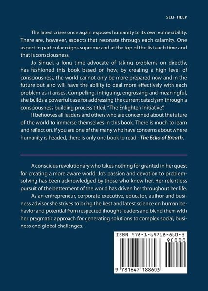 In a world focused on a combination of health issues (the COVID-19 pandemic) and politically oriented problems (social unrest relating to racial inequities and systemic racism) it is both essential and important that thoughtful solutions are provided. "The Echo of Breath" offers up relevant answers to the primary question regarding "what can we do" to make a better world for ourselves, families, communities, organizations and institutions. The answer starts and ends with consciousness and how it impacts each of us every day of our life. This call to action implores all of us to take our head out of the sand and support the actions required to take us to a new level of enhanced consciousness, a level that will address existing and future problems. In a world immersed in survival mode, the book provides a roadmap and the needed development to implement what is required. It is an urgent message as well as a hopeful one. Everything begins with consciousness. Without it we are just stumbling through life in a reactive mode, instead of being proactive in addressing our problems. This book offers up numerous conversations between the main characters who have a vested interest in creating answers to the overriding questions of our time. What is known may no longer be relevant, what is unknown is the opportunity for greater possibilities for all.