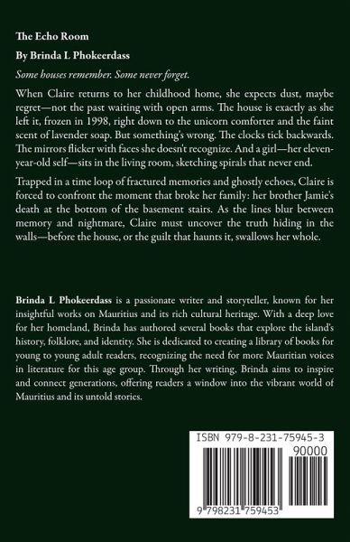 The Echo Room By Brinda L Phokeerdass Some houses remember. Some never forget. When Claire returns to her childhood home, she expects dust, maybe regret-not the past waiting with open arms. The house is exactly as she left it, frozen in 1998, right down to the unicorn comforter and the faint scent of lavender soap. But something's wrong. The clocks tick backwards. The mirrors flicker with faces she doesn't recognize. And a girl-her eleven-year-old self-sits in the living room, sketching spirals that never end. Trapped in a time loop of fractured memories and ghostly echoes, Claire is forced to confront the moment that broke her family: her brother Jamie's death at the bottom of the basement stairs. As the lines blur between memory and nightmare, Claire must uncover the truth hiding in the walls-before the house, or the guilt that haunts it, swallows her whole.