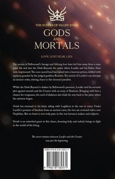 IN THIS THRILLING FANTASY DRAMA, J.D. NETTO DIVES DEEPER INTO THE LORE BEHIND IMMORTAL CROWNS, TRANSPORTING THE READER TO A WORLD WHERE GODS ARE SINNERS, MORTALS ARE BAIT, AND FAITH IS A THORN IN THE FLESH. "The Echoes of Fallen Stars is a creation that every fantasy lover must have in their collection. This epic weaves a rich tapestry of gods and mortals, sinners and saviors." - USA Today Love. Lust. Fear. Lies. The secrets of Bellwound's lineage and lifelong love have led him away from a once quiet life and into the Dark Beyond, the realm where Lucifer and his Fallen Stars were imprisoned. The once sacred land has turned into a luscious prison, riddled with mystery, guarded by the judged goddess Romiria. The arrival of Lucifer's son disrupts an ancient order, stirring chaos in this doomed paradise. While the Dark Beyond is shaken by Bellwound's presence, Lucifer and his servants plot against mortals and the Creator with an army of Shadows. Bringing with him a chance for vengeance, the seed of darkness also finds his way back to the place where the universe began. Oriah has returned to his kind, siding with Loghleen in the war to come. Under Lucifer's promise of freedom from an ancient curse, the two are crowned rulers over Nephilins. But no heart is ever truly pure in this war between makers and subjects. Death is an uninvited guest in this chaos, dooming holy and unholy beings to fight in the world of the living. The secret romance between Lucifer and Hanell the Creator was just the beginning.
