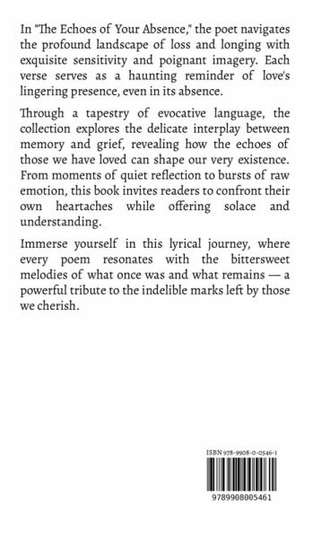 In "The Echoes of Your Absence," the poet navigates the profound landscape of loss and longing with exquisite sensitivity and poignant imagery. Each verse serves as a haunting reminder of love's lingering presence, even in its absence. Through a tapestry of evocative language, the collection explores the delicate interplay between memory and grief, revealing how the echoes of those we have loved can shape our very existence. From moments of quiet reflection to bursts of raw emotion, this book invites readers to confront their own heartaches while offering solace and understanding. Immerse yourself in this lyrical journey, where every poem resonates with the bittersweet melodies of what once was and what remains - a powerful tribute to the indelible marks left by those we cherish.