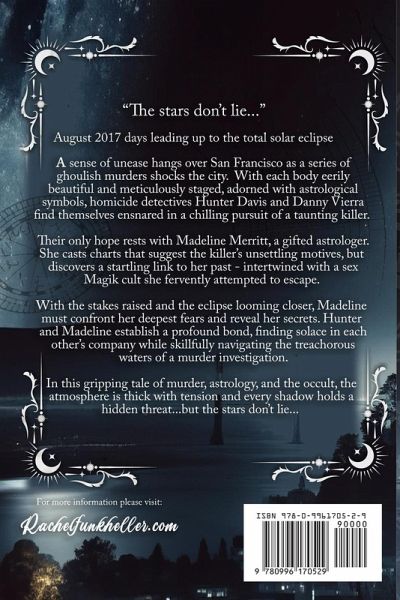 "The stars don't lie...." A sense of unease hangs over San Francisco as a series of ghoulish murders shocks the city. With each body eerily beautiful and meticulously staged, adorned with astrological symbols, homicide detectives Hunter Davis and Danny Vierra find themselves ensnared in a chilling pursuit of a taunting killer. Their only hope rests with Madeline Merritt, a gifted astrologer. She casts charts that suggest the killer's unsettling motives but discovers a startling link to her past - intertwined with a sex Magik cult she fervently attempted to escape. With the stakes raised and the eclipse looming closer, Madeline must confront her deepest fears and reveal her secrets. Hunter and Madeline establish a profound bond, finding solace in each other's company while skillfully navigating the treacherous waters of a murder investigation. In this gripping tale of murder, astrology, and the occult, the atmosphere is thick with tension, and every shadow holds a hidden threat...but the stars don't lie...