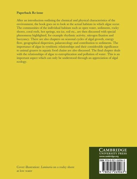 After an introduction outlining the chemical and physical characteristics of the environment, the book goes on to look at the actual habitats in which algae occur. The communities of the individual habitats such as open water, sediments, rocky shores, coral reefs, hot springs, sea ice, soil, etc., are then discussed with special phenomena highlighted, for example rhythmic activity, nitrogen fixation and buoyancy. There are also chapters on seasonal cycles of algal growth, energy flow, geographical dispersion, palaeo-ecology and contribution to sediments. The importance of algae in symbiotic relationships and their considerable significance to animal grazers in aquatic food chains are also discussed. The final chapter deals with the relationships of algae to eutrophication and pollution of water. This is an important aspect, which can only be understood through an appreciation of algal ecology.