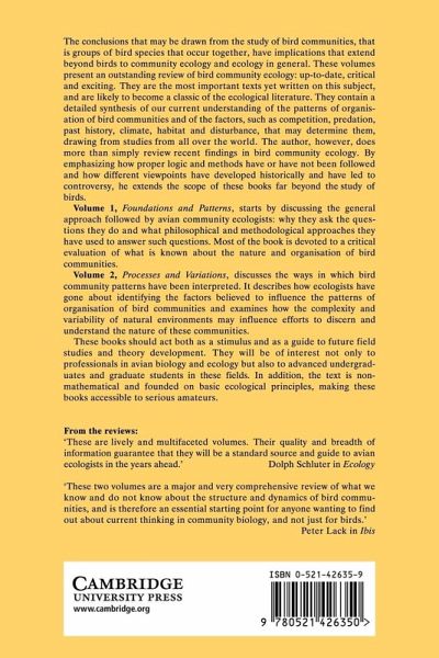 Processes and Variations, discusses the ways in which bird community patterns have been interpreted. It describes how ecologists have gone about identifying the factors believed to influence the patterns of organization of of bird communities and examines how the complexity and variability of natural environments may influence efforts to discern and understand the nature of these communities.