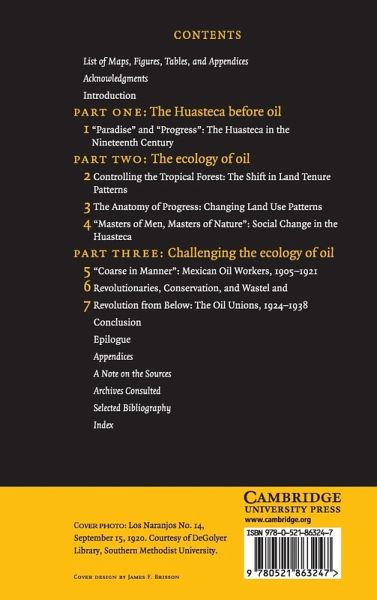 An exploration of the social and environmental consequences of oil extraction in the tropical rainforest. Using northern Veracruz as a case study, the author argues that oil production generated major historical and environmental transformations in land tenure systems and uses, and social organisation. Such changes, furthermore, entailed effects, including the marginalisation of indigenes, environmental destruction, and tense labour relations. In the context of the Mexican Revolution (1910-1920), however, the results of oil development did not go unchallenged. Mexican oil workers responded to their experience by forging a politicised culture and a radical left militancy that turned 'oil country' into one of the most significant sites of class conflict in revolutionary Mexico. Ultimately, the book argues, Mexican oil workers deserve their share of credit for the 1938 decree nationalising the foreign oil industry - heretofore reserved for President Lazaro Cardenas - and thus changing the course of Mexican history.