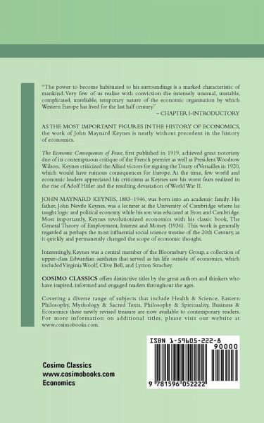 "The power to become habituated to his surroundings is a marked characteristic of mankind. Very few of us realise with conviction the intensely unusual, unstable, complicated, unreliable, temporary nature of the economic organisation by which Western Europe has lived for the last half century." - CHAPTER I-INTRODUCTORY As the most important figures in the history of economics, the work of John Maynard Keynes is nearly without precedent in the history of economics. THE ECONOMIC CONSEQUENCES OF PEACE, first published in 1919, achieved great notoriety due of its contemptuous critique of the…mehr