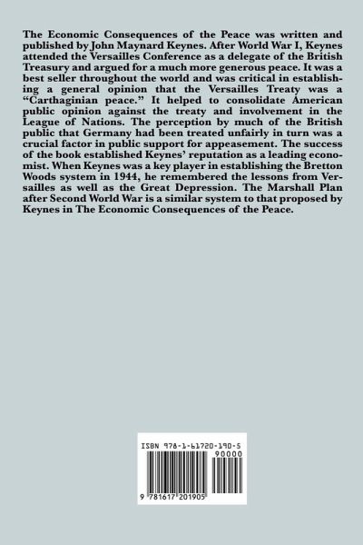 The Economic Consequences of the Peace was written and published by John Maynard Keynes. After World War I, Keynes attended the Versailles Conference as a delegate of the British Treasury and argued for a much more generous peace. It was a best seller throughout the world and was critical in establishing a general opinion that the Versailles Treaty was a "Carthaginian peace." It helped to consolidate American public opinion against the treaty and involvement in the League of Nations. The perception by much of the British public that Germany had been treated unfairly in turn was a crucial factor in public support for appeasement. The success of the book established Keynes' reputation as a leading economist. When Keynes was a key player in establishing the Bretton Woods system in 1944, he remembered the lessons from Versailles as well as the Great Depression. The Marshall Plan after Second World War is a similar system to that proposed by Keynes in The Economic Consequences of the Peace. Wilder Publications is a green publisher. All of our books are printed to order. This reduces waste and helps us keep prices low while greatly reducing our impact on the environment.