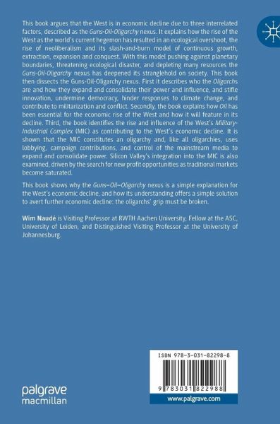 This book argues that the West is in economic decline due to three interrelated factors, described as the Guns-Oil-Oligarchy nexus. It explains how the rise of the West as the world's current hegemon has resulted in an ecological overshoot, the rise of neoliberalism and its slash-and-burn model of continuous growth, extraction, expansion and conquest. With this model pushing against planetary boundaries, threatening ecological disaster, and depleting many resources the Guns-Oil-Oligarchy nexus has deepened its stranglehold on society. This book then dissects the Guns-Oil-Oligarchy nexus. First it describes who the Oligarchs are and how they expand and consolidate their power and influence, and stifle innovation, undermine democracy, hinder responses to climate change, and contribute to militarization and conflict. Secondly, the book explains how Oil has been essential for the economic rise of the West and how it will feature in its decline. Third, the book identifies the rise and influence of the West's Military-Industrial Complex (MIC) as contributing to the West's economic decline. It is shown that the MIC constitutes an oligarchy and, like all oligarchies, uses lobbying, campaign contributions, and control of the mainstream media to expand and consolidate power. Silicon Valley's integration into the MIC is also examined, driven by the search for new profit opportunities as traditional markets become saturated.