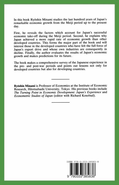 In this book Minami studies the last hundred years of Japan's remarkable economic growth from the Meiji period up to the present day. First he reveals the factors which account for Japan's successful economic take-off during the Meiji period. Secondly he explains why Japan achieved a more rapid rate of economic growth than other developed countries. This forms the major part of the book and will interest those people in the developed countries who have felt the full force of Japan's export drive and whose own industries are consequently in decline. Finally the author evaluates the results of Japan's economic growth and makes predictions for its future. The book makes a comprehensive survey of the Japanese experience in the pre- and postwar periods and points out lessons not only for developed countries but also for developing countries struggling to achieve a similar take-off.