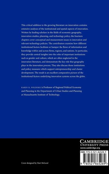 This critical addition to the growing literature on innovation contains extensive analyses of the institutional and spatial aspects of innovation. Written by leading scholars in the fields of economic geography, innovation studies, planning, and technology policy, the fourteen chapters cover conceptual and measurement issues in innovation and relevant technology policies. The contributors examine how different institutional factors facilitate or hamper the flows of information and knowledge within and across firms, regions, and nations. In particular, they provide insights into the roles of important institutions such as gender and culture which are often neglected in the innovation literature, and demonstrate the key role which geography plays in the innovation process. Institutions and policy measures which support entrepreneurship and cluster development are also discussed. The result is a comparative picture of the institutional factors underlying innovation systems across the globe.