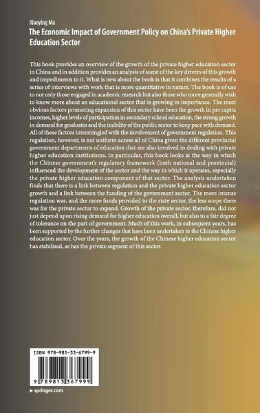 This book provides an overview of the growth of the private higher education sector in China and in addition provides an analysis of some of the key drivers of this growth and impediments to it. What is new about the book is that it combines the results of a series of interviews with work that is more quantitative in nature. The book is of use to not only those engaged in academic research but also those who more generally wish to know more about an educational sector that is growing in importance. The most obvious factors promoting expansion of this sector have been the growth in per capita incomes, higher levels of participation in secondary school education, the strong growth in demand for graduates and the inability of the public sector to keep pace with demand. All of these factors intermingled with the involvement of government regulation. This regulation, however, is not uniform across all of China given the different provincial government departments of education that arealso involved in dealing with private higher education institutions. In particular, this book looks at the way in which the Chinese government's regulatory framework (both national and provincial) influenced the development of the sector and the way in which it operates, especially the private higher education component of that sector. The analysis undertaken finds that there is a link between regulation and the private higher education sector growth and a link between the funding of the government sector. The more intense regulation was, and the more funds provided to the state sector, the less scope there was for the private sector to expand. Growth of the private sector, therefore, did not just depend upon rising demand for higher education overall, but also to a fair degree of tolerance on the part of government. Much of this work, in subsequent years, has been supported by the further changes that have been undertaken in the Chinese higher education sector. Over the years, the growth of the Chinese higher education sector has stabilised, as has the private segment of this sector.