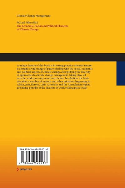 A unique feature of this book is its strong practice-oriented nature: it contains a wide range of papers dealing with the social, economic and political aspects of climate change, exemplifying the diversity of approaches to climate change management taking place all over the world, in a way never seen before. In addition, the book describes a number of projects and other initiatives happening in Africa, Asia, Europe, Latin American and the Australasian region, providing a profile of the diversity of works taking place today.