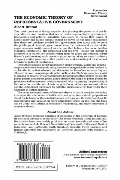 This book provides a theory capable of explaining the patterns of public expenditures and taxation that occur under representative government. Economists and political scientists have come to realize that issues of public policy and public finance cannot be solved on the naive assumption that these are problems tackled by a government that exists only to serve the public good. Instead, government must be understood as one of the major economic institutions of society, one that behaves like more familiar economic institutions--the household and the firm--though the market it confronts is a market for policies rather than for goods and services. Albert Breton's pathbreaking work remains important in taking us toward a theory of representative government that enables an understanding of the observed behavior of political institutions. The author's analysis is cast in a relatively simple demand, supply and demand-supply-equilibrium framework, using the tools of marginal and stability analysis to explain the forces that influence and determine the flow of resources as they are allocated between competing ends in the public sector. The book presents a model of demand by citizens, who are assumed to be maximizing their desires for specific public policies and private goods, and a model of the supply of public policies by politicians and bureaucrats, who are assumed to be maximizing the probability of their re-election and the size of their budgets. Breton defines government policies and the institutional framework for collective choices in terms that render them amenable to further analysis. The main accomplishment of Breton's theory is that it provides the ability to analyze the interaction of individuals and generates testable propositions about the behavior of these individuals as well as about the behavior of public expenditures and taxation in more aggregative terms. In this way the book will be useful to students of economics, economists, and those interested in economic theory.